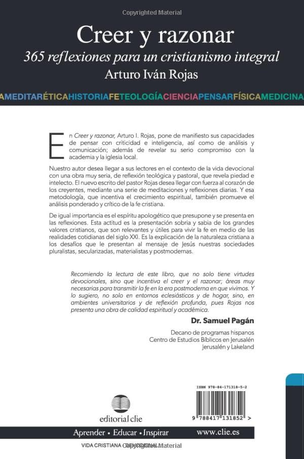 En Creer y razonar , Arturo I. Rojas, pone de manifiesto sus capacidades de pensar con criticidad e inteligencia, así como de análisis y comunicación; además de revelar su serio compromiso con la academia y la iglesia local.Arturo Ivan Rojas desea llegar a sus lectores en el contexto de la vida devocional con una obra muy seria, de reflexión teológica y pastoral, que revela piedad e intelecto.El nuevo escrito del pastor Rojas desea llegar con fuerza al corazón de los creyentes, mediante una serie de meditaciones y reflexiones diarias. Y esa metodología, que incentiva el crecimiento espiritual, también promueve el análisis ponderado y crítico de la fe cristiana.De igual importancia es el espíritu apologético que presupone y se presenta en las reflexiones. Esta actitud es la presentación sobria y sabia de los grandes valores cristianos, que son relevantes y útiles para vivir la fe en medio de las realidades cotidianas del siglo XXI.Es la explicación de la naturaleza cristiana a los desafíos que le presentan al mensaje de Jesús nuestras sociedades pluralistas, secularizadas, materialistas y postmodernas.